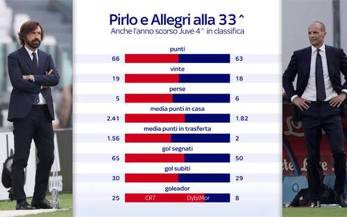 - Juve di Pirlo 2020-21: 19 vittorie, 9 pari e 5 ko (media punti 2)