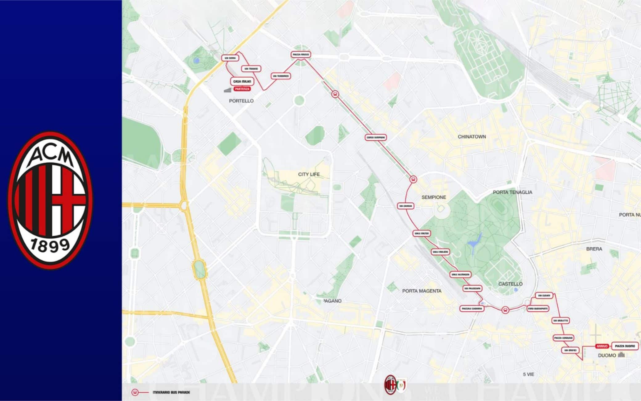 La gioia in campo a Reggio Emilia, la premiazione con la coppa scudetto alzata da capitan Romagnoli. Una notte di festa tra piazza Duomo e Casa Milan, con migliaia di tifosi che hanno invaso le strade di Milano, il discorso di Ibra e il ballo di Pioli. Ma la festa non finisce qui: oggi infatti la squadra di Pioli farà una parata per le vie della città con il pullman scoperto portando il trofeo sotto la Madonnina. L'appuntamento per la partenza è alle 18.00 a Casa Milan. Questo il percorso del bus: Piazza Gino Valle, Viale Traiano, Viale Scarampo, Viale Serra, Viale Certosa, Piazza Firenze, Corso Sempione, Via Canova, Viale Milton, Via Moliere, Viale Alemagna, Via Paleocapa, Piazzale Cadorna, Foro Buonaparte, Via Cusani, Via Broletto, Piazza Cordusio, Via Orefici per poi concludere in Piazza del Duomo. La parata dovrebbe concludersi intorno alle 22.00.