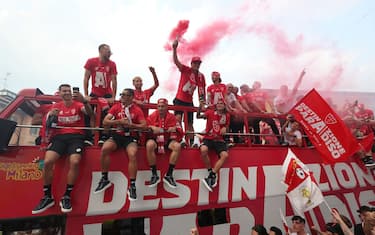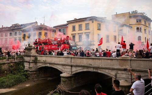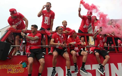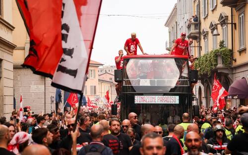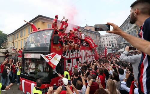 Una marea di tifosi biancorossi per festeggiare la promozione del Monza in Serie A. Parata dei giocatori sul bus lungo le strade della città, poi spettacolo allo stadio Brianteo dove Silvio Berlusconi è stato acclamato e applaudito: "Silvio portaci in Europa!", i ripetuti cori dei tifosi del Monza. Anche Balotelli a salutare i suoi ex compagni