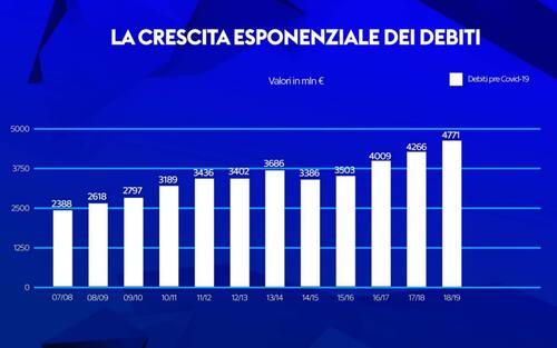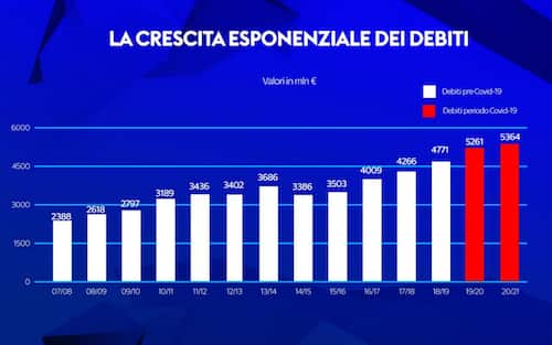- L'intervallo analizzato è quello tra il 2007 e il 2019 dove si è raggiunto un indebitamento totale di quasi 4,7 miliardi di euro: si tratta del doppio rispetto ai 2,4 miliardi registrati nel 2007/08, a causa in particolare della crescita dei debiti finanziari. Fa riflettere anche come il costo dello stipendio "allargato" incida per il 66% del valore della produzione e del 92% dei ricavi al netto delle plusvalenze