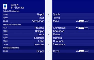La sesta giornata del campionato di Serie A si apre con Napoli-Spezia sabato alle 15.00 e prosegue con altre due partite del sabato: Inter-Torino e Sampdoria-Milan (in diretta su Sky Sport Calcio, Sky Sport UNO, Sky Sport 4K), Sei le partite della domenica, in vista del secondo turno delle coppe europee della prossima settimana, con tre appuntamenti alle 15.00. All'ora di pranzo scendono in campo Atalanta e Cremonese (in diretta su Sky Sport Calcio). Il turno si chiude lunedì 12 settembre alle 20.45 con Empoli-Roma (in diretta su Sky Sport Calcio, Sky Sport 4K).