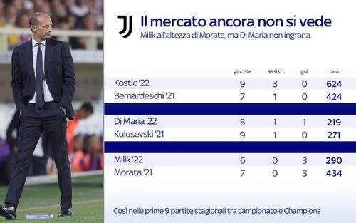La crisi della Juventus e l'impatto negativo del calciomercato attraverso un confronto tra 6 nuovi acquisti bianconeri (Bremer, Paredes, Pogba, Kostic, Di Maria e Milik) e i giocatori che hanno sostituito (De Ligt, Bentancur, Ramsey, Bernardeschi, Kulusevski e Morata). Ecco i loro numeri dopo le prime 9 partite ufficiali della stagione