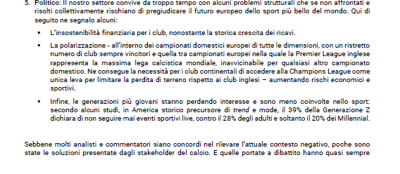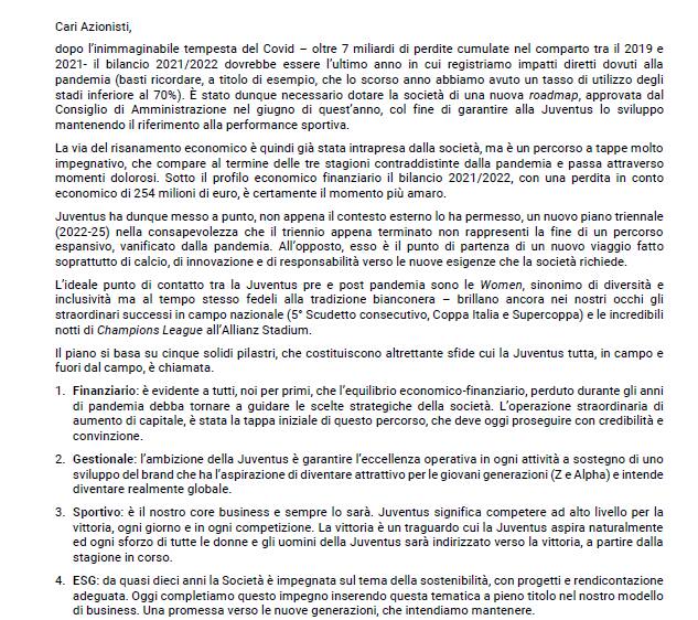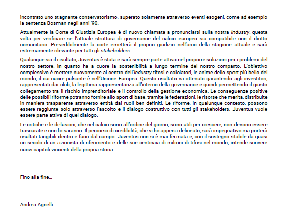 Nella lettera c'è anche un riferimento al rapporto con la Uefa e alla questione Superlega. "La Corte di Giustizia Europea è di nuovo chiamata a pronunciarsi sulla nostra industry, questa volta per verificare se l’attuale struttura di governance del calcio europeo sia compatibile con il diritto comunitario. Prevedibilmente la corte emetterà il proprio giudizio nell’arco della stagione attuale e sarà estremamente rilevante per tutti gli stakeholders". Interessante anche il passaggio sulla squadra femminile. "L’ideale punto di contatto tra la Juventus pre e post pandemia sono le Women, sinonimo di diversità e inclusività ma al tempo stesso fedeli alla tradizione bianconera".