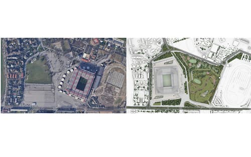 - I club accettano di ridurre gli spazi volumetrici totali, rinunciando a parte degli edifici che all’interno del distretto sarebbero stati destinati ad attività commerciali. Sparisce dal progetto la cosiddetta rifunzionalizzazione del Meazza.