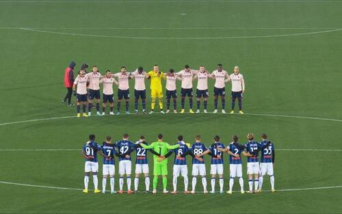 - Durante il minuto di raccoglimento, i giocatori del Bologna si sono stretti in un abbraccio emozionante, con la foto di Mihajlovic e di Vialli proiettata sul maxi schermo