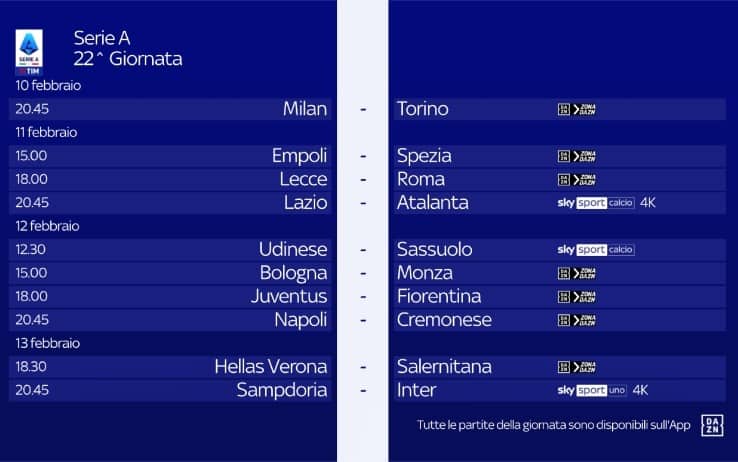 Serie A, il programma della 22^ giornata