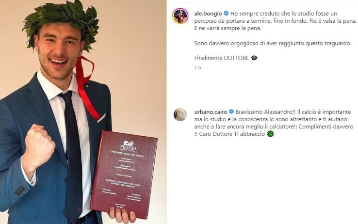 "Finalmente dottore": il difensore del Torino, Alessandro Buongiorno, festeggia sui social un importante traguardo personale: la laurea in Economia Aziendale. "Ho sempre creduto che lo studio fosse un percorso da portare a termine, fino in fondo. Ne è valsa la pena. E ne varrà sempre la pena" ha aggiunto il 23enne centrale granata sui propri profili social. Buongiorno si è laureato con la tesi dal titolo 'Marketing emozionale nel calcio: l'esempio del Torino Fc'. E sono arrivati anche i complimenti di Urbano Cairo: "Bravissimo Alessandro: il calcio è importante, ma lo studio e la conoscenza lo sono altrettanto e ti aiutano anche a fare ancora meglio il calciatore", il commento del presidente del Torino. E sempre il club granata ha aggiunto su twitter: "Orgogliosi di te"