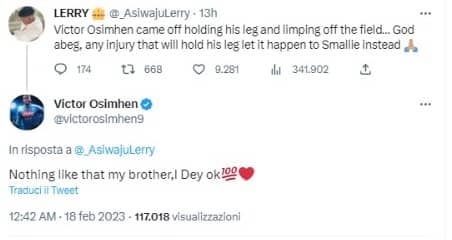 napoliSospiro di sollievo per Osimhen, sostituito a 6 minuti dalla fine contro il Sassuolo per un fastidio muscolare: esclusi problemi seri, si trattava solo di un crampo. Lo stesso attaccante ha rassicurato tutti attraverso i social, rispondendo a un utente su Twitter