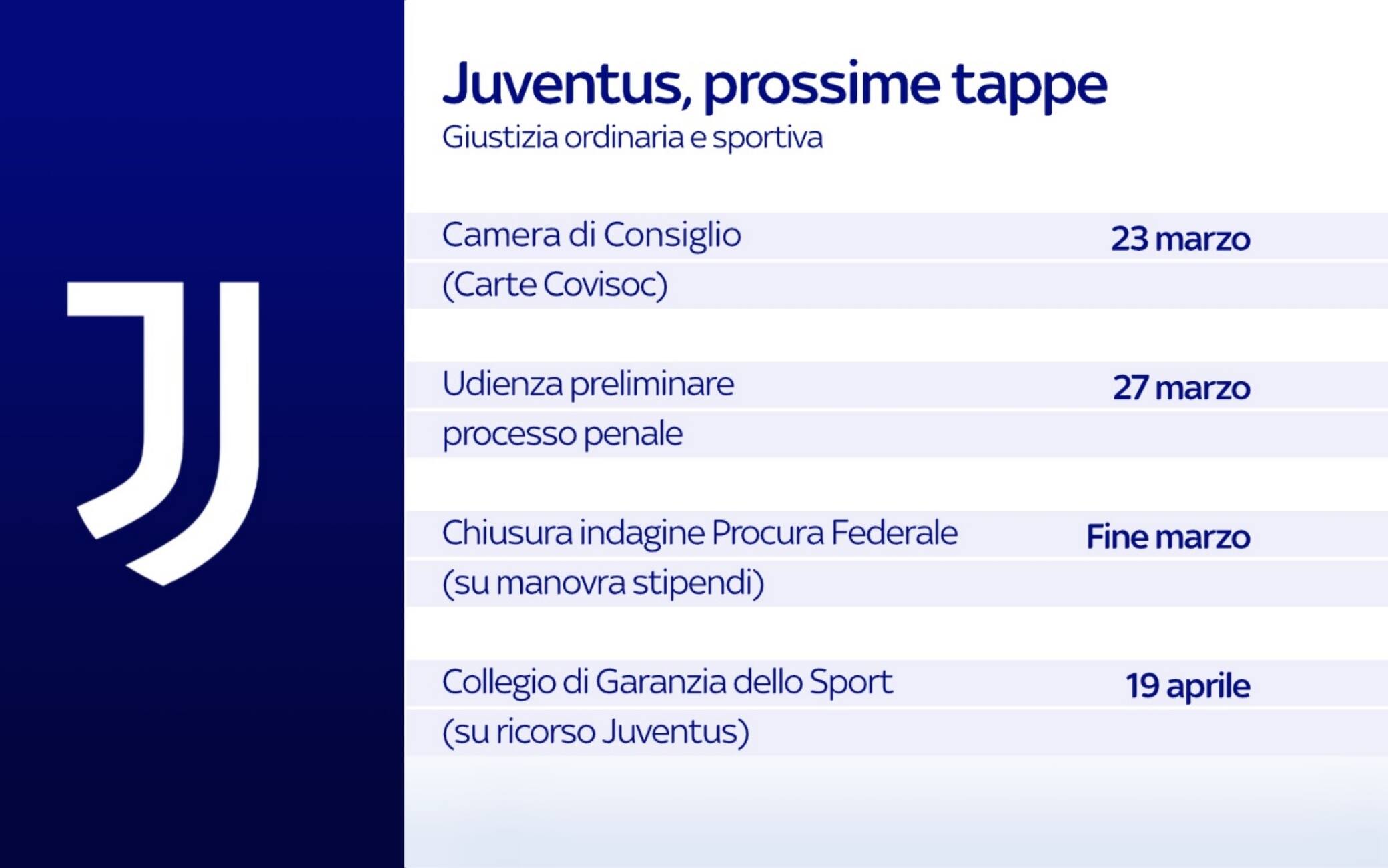 Dall'appuntamento di giovedì presso la camera di consiglio con un valore formale alla data importante del 19 aprile, quando il Collegio di Garanzia dello sport si esprimerà sul ricorso dei bianconeri contro la penalizzazione di 15 punti. Cosa succederà nelle prossime settimane in casa Juventus