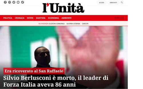L'UNITA': "SILVIO BERLUSCONI E' MORTO, IL LEADER DI FORZA ITALIA AVEVA 86 ANNI"