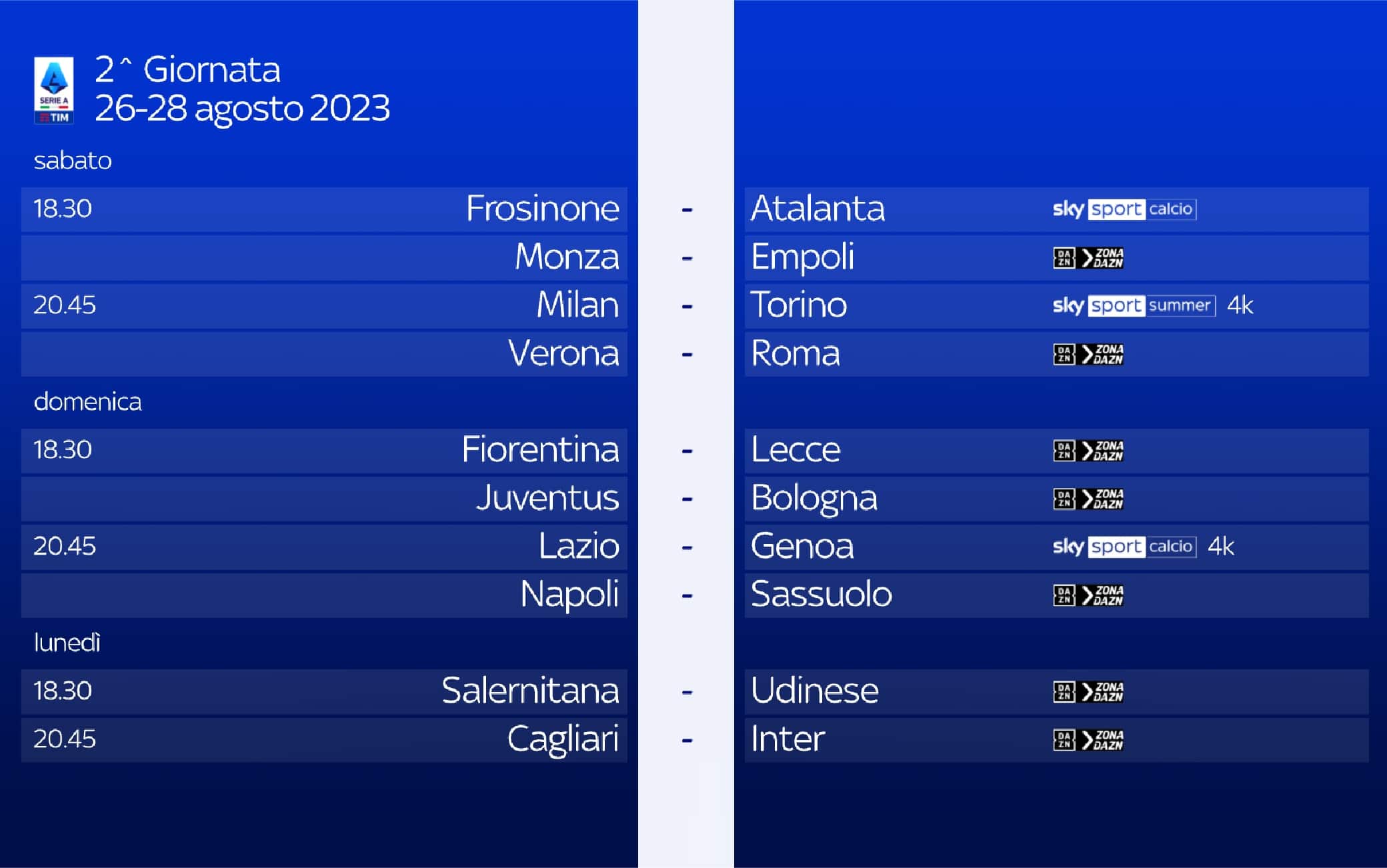 Due gare chiudono la seconda giornata di Serie A: Salernitana-Udinese in campo alle 18:30, dalle 20:45 spazio a Cagliari-Inter. Entrambe le gare saranno dispinobili su app DAZN e canale ZONA DAZN (214 del telecomando Sky)