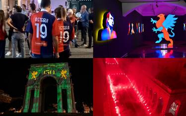 - Altre coreografie e giochi di luce sono comparsi già dalla tarda serata di ieri su alcuni monumenti della città: qui nella foto l'Arco di piazza della Vittoria a Genova illuminato dal Grifone del Genoa e dalle scritta "130" e "1893-2023"