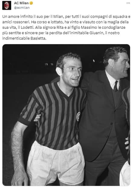 "Un amore infinito il suo per il Milan, per tutti i suoi compagni di squadra e amici rossoneri. Ha corso e lottato, ha vinto e vissuto con la maglia della sua vita, il Lodetti. Alla signora Rita e al figlio Massimo le condoglianze più sentite e sincere per la perdita dell'inimitabile Giuanin, il nostro indimenticabile Basletta"