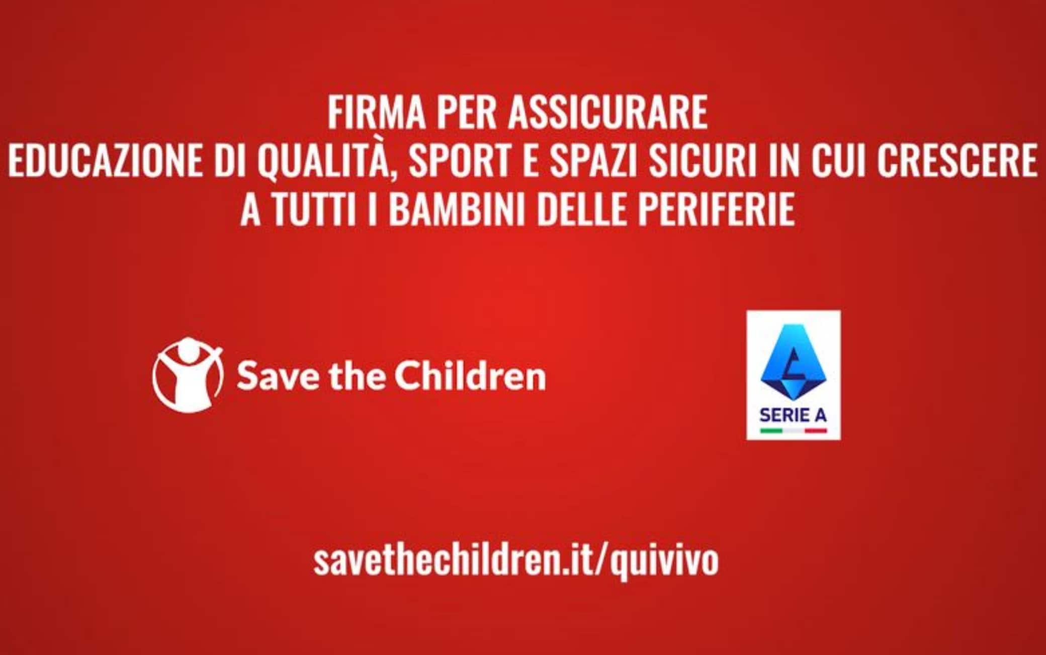Da sabato 21 a lunedì 23 ottobre, tutte le squadre della Serie A scenderanno in campo per supportare Save the Children invitando tutti i tifosi ad aderire alla campagna firmando la petizione di Save the Children su www.savethechildren.it, per assicurare a tutti i bambini delle periferie italiane educazione di qualità, attività sportive, opportunità e spazi sicuri in cui crescere.
