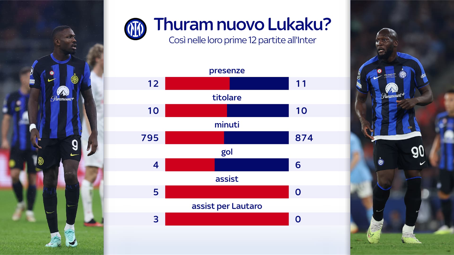 L’Inter è rimasta imbattuta in 11 delle ultime 12 sfide contro la Roma in campionato (5 vittorie, 6 pareggi), vincendo quattro delle cinque più recenti: l’unico successo giallorosso nel periodo risale alla gara d’andata dello scorso campionato, il 1° ottobre 2022 (2-1 con i gol di Dybala e Smalling, Dimarco per i nerazzurri). La Roma è la squadra contro cui l’Inter ha ottenuto il maggior numero di vittorie (76) e ha realizzato più reti (293) nella sua storia in Serie A; in particolare, i nerazzurri sono rimasti senza segnare solo in una delle ultima 18 sfide contro i giallorossi in campionato. La Roma ha evitato la sconfitta in quattro delle ultime sei trasferte contro l’Inter in campionato (1 vittoria, 3 pari), vincendo la più recente: l’ultima volta che ha vinto due gare esterne di fila contro i nerazzurri in Serie A risale al periodo tra 2012 e 2013 (3-1 con Zdenek Zeman e 3-0 con Rudi Garcia). Nonostante l’Inter abbia vinto ben sette delle prime nove gare di questo campionato, non ha trovato il successo negli ultimi due appuntamenti casalinghi: sconfitta contro il Sassuolo il 27 settembre e pareggio contro il Bologna il 7 ottobre; in particolare, i nerazzurri non collezionano due “X” di fila in casa in Serie A da ottobre 2021, in quell’occasione contro Atalanta e Juventus. Dopo aver ottenuto appena un successo nelle prime sei gare di questo campionato (2 pareggi, 3 sconfitte), la Roma ha vinto tutte le tre partite più recenti in Serie A e non ottiene più vittorie di fila nella competizione da agosto 2020, con Paulo Fonseca in panchina. L’Inter ha segnato ben 24 reti a fronte di cinque subite in questa Serie A, nessuna squadra ha una differenza reti migliore nei cinque grandi campionati europei in corso: +19, come il Bayern Monaco; i nerazzurri hanno eguagliato la loro seconda miglior differenza in assoluto dopo le prime nove gare stagionali (meglio solo nel 1933/34 con +20, mentre totalizzarono un +19 anche nel 1960/61). Romelu Lukaku ha segnato otto reti nelle sue ultime nove trasferte di Serie A, mentre non è andato a segno in 10 delle ultime 13 gare giocate in campionato a San Siro. L’attaccante della Roma è il giocatore che ha registrato la più alta percentuale realizzativa con la maglia dell’Inter dal 2004/05, tra i calciatori con almeno 30 presenze in nerazzurro nel periodo: 23%.