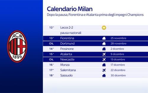 - Con le eccezioni di Atalanta e Fiorentina il calendario non presenta scontri diretti, ma le ultime partite contro Udinese e Lecce hanno dimostrato come il Milan debba ricostruire le sue certezze al di là dell'avversario di turno