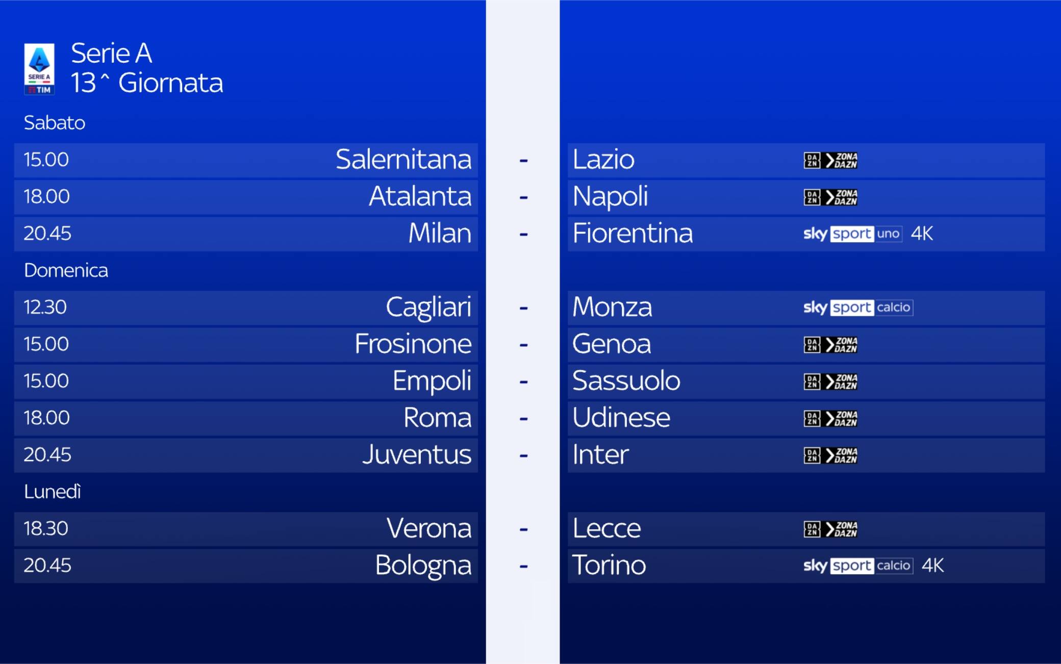 La partita tra Frosinone e Genoa, valida per la 13^ giornata di Serie A, sarà trasmessa domenica 26 novembre alle 15.00 in diretta sull’app di DAZN, disponibile nella sezione App di Sky Q e Sky Glass. Gli abbonati Sky Q (via satellite o via internet) e Sky Glass che sono anche clienti DAZN, potranno accedere all’offerta DAZN anche col controllo vocale, tramite il comando “Apri DAZN”, comodamente in unico posto e con un unico dispositivo. Su Sky Q e My Sky, la partita è visibile anche su ZONA DAZN, disponibile al canale 214 del telecomando Sky. Per vedere il canale ZONA DAZN, i clienti DAZN devono aderire ad una specifica opzione disponibile all’interno dell’area “il mio account” su dazn.com. Per abbonarsi a DAZN ed attivare l’opzione per vedere il canale ZONA DAZN su Sky Q o My Sky, è necessario andare su dazn.com/sky e seguire le indicazioni per la sottoscrizione.