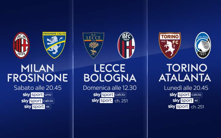 - ore 20.45: Milan-Frosinone su Sky Sport Uno, Sky Sport Calcio, Sky Sport 251, Sky Sport 4K e in streaming su NOW. Telecronaca di Federico Zancan con il commento di Luca Marchegiani. A bordocampo Peppe Di Stefano e Manuele Baiocchini.