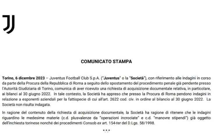 La procura della Repubblica di Roma ha chiesto alla Juventus di acquisire documentazione relativa ai bilanci fino al 30 giugno 2022. A renderlo noto è lo stesso club bianconero attraverso una nota ufficiale: "La società non riuslta indagata"