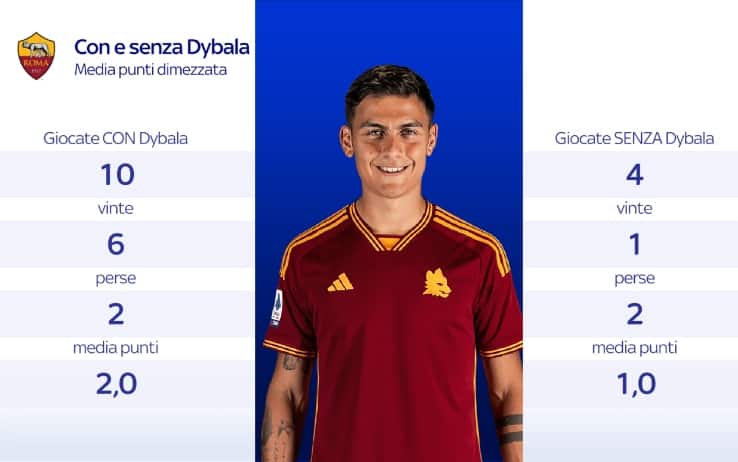 Un peso ben diverso dall'apporto Dybala. Con lui in campo la Roma ha una media di due punti a partita. Senza l'argentino, la media si dimezza: un solo punto a partita. La qualità che incide di più.