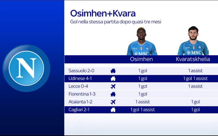 napoliLa vittoria contro il Cagliari regala ad Osimhen e Kvaratskhelia gol e sorrisi. La squadra di Mazzarri vince ancora in casa e mette un altro tassello per ritrovare quel feeling con il Maradona che mancava da diverso tempo: l'obiettivo ora è rimanere stabilmente in zona Champions League nel segno della coppia più bella di Napoli