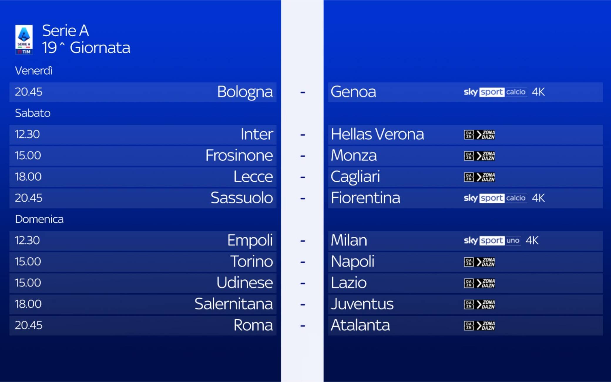 Calendario Serie A, le partite e gli orari della 19^ giornata