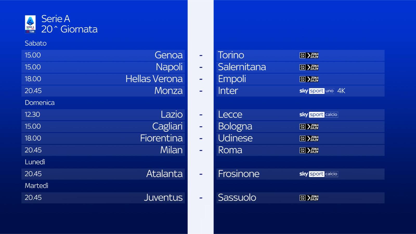 guida tvLa 20^ giornata di campionato, prima del girone di ritorno, si chiude oggi, martedì 16 gennaio, alle 20.45 con Juventus-Frosinone