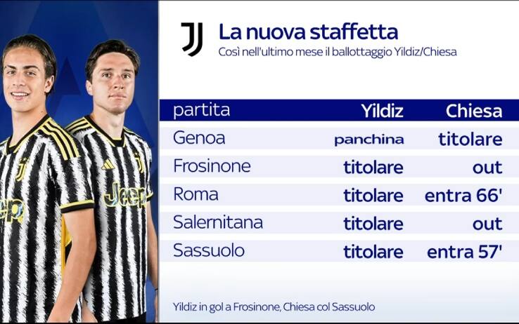 juventusSe Vlahovic, reduce dalla doppietta col Sassuolo, è intoccabile in questo momento, per l'altra maglia in attacco è ballottaggio aperto tra Federico Chiesa e Kenan Yildiz: a Lecce, domenica 21 gennaio, sarà ancora staffetta, come già accaduto nel match vinto contro i neroverdi
