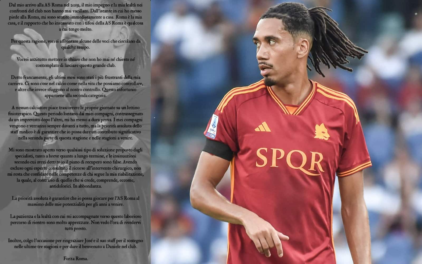 Smalling conclude così il proprio messaggio: "La pazienza e la lealtà con cui mi accompagnate verso questo laborioso percorso di rientro sono molto apprezzate. Non vedo l'ora di rivedervi tutti presto. Inoltre, colgo l'occasione per ringraziare José e il suo staff per il sostegno nelle ultime tre stagioni e per dare il benvenuto a Daniele nel club. Roma è la mia casa, e il rapporto che ho instaurato con i tifosi della Roma è qualcosa a cui tengo molto".
