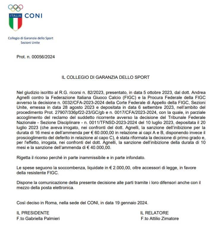 Il Collegio di Garanzia ha respinto il ricorso dell'ex presidente della Juventus, confermando dunque i 10 mesi di inibizione che gli erano stati inflitti in appello (dopo l'iniziale condanna di 16 mesi in primo grado)
