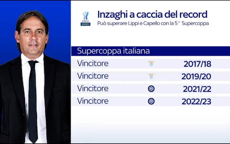 La sfida tra Napoli e Inter è anche un duello a distanza tra Walter Mazzarri e Simone Inzaghi. L'allenatore dell'Inter è a caccia di un trofeo che significherebbe record: l'ex Lazio, conquistando la sua quinta Supercoppa, raggiungerebbe Lippi all'interno di questa speciale classifica. Il 're di (super)coppe' Inzaghi, infatti, ha già alzato il trofeo nelle edizioni 2017/18 (Juventus-Lazio 2-3), 2019/20 (Juventus-Lazio 1-3), 2021/22 (Inter-Juventus 2-1), 2022/23 (Milan-Inter 0-3).