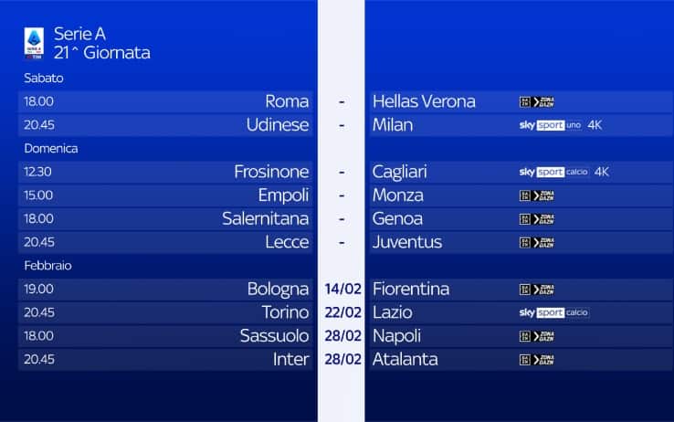 La partita tra Udinese e Milan valida per la 21^ giornata di Serie A sarà trasmessa sabato 20 gennaio alle 20.45 in diretta su Sky, canali Sky Sport Uno, Sky Sport Calcio, Sky Sport 251, Sky Sport 4K e in streaming su NOW. Telecronaca di Riccardo Gentile con il commento di Luca Marchegiani. A bordocampo Francesco Cosatti e Peppe Di Stefano. Dalle 20.00 e dalle 22.40 appuntamento con 'L'Originale' con Alessandro Bonan, Paolo Condò, Gianluca Di Marzio, Alessandro Costacurta e Veronica Baldaccini.