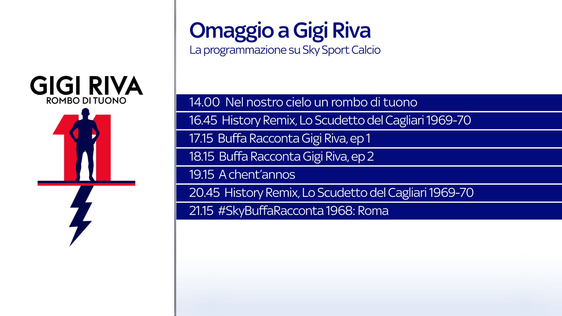 Il giorno dopo la scomparsa della leggenda del calcio italiano Gigi Riva, sarà possibile rivivere le sue grandi imprese attraverso gli speciali di Sky Sport. Doppio appuntamento con Federico Buffa, i due episodi di #SkyBuffaRacconta Gigi Riva e #SkyBuffaRacconta 1968: Roma. Alle 19.15, su Sky Sport Calcio, 'A chent’annos', il docufilm realizzato nel 2020 per i 100 anni del Cagliari Calcio, oltre all'History Remix, Lo Scudetto del Cagliari 1969-70. Si inizia alle 14.00 su Sky Sport Calcio con il film che riprende nel titolo il soprannome che a Riva diede Gianni Brera: 'Nel nostro cielo rombo di tuono'. Il docufilm in onda anche alle 21.15 su Sky Cinema Due, alle 23.10 su Sky Documentaries, in streaming su NOW e disponibile on demand.