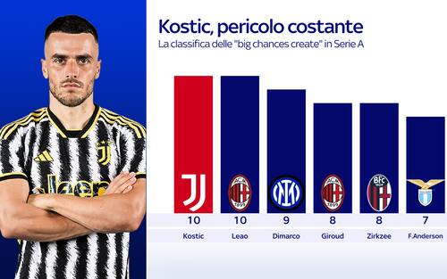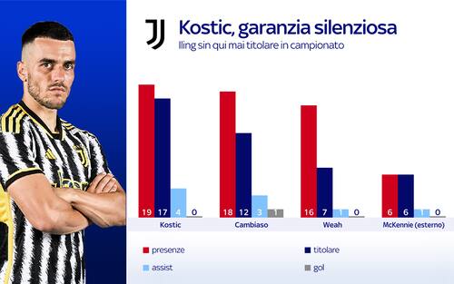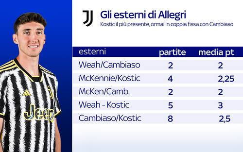 - I numeri dicono infatti che, sebbene Weah-Kostic sia la coppia che porta la media punti più alta alla Juventus, quella formata da Kostic e Cambiaso è quella a cui Allegri si affida maggiormente. Sono infatti 8 i match in cui il serbo e l’azzurro sono partiti titolari: con loro la media è di 2.5 punti a partita