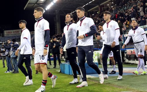 - Cagliari in campo per il riscaldamento: i giocatori rossoblù indossano una maglia ispirata a quella dello scudetto del 1970.