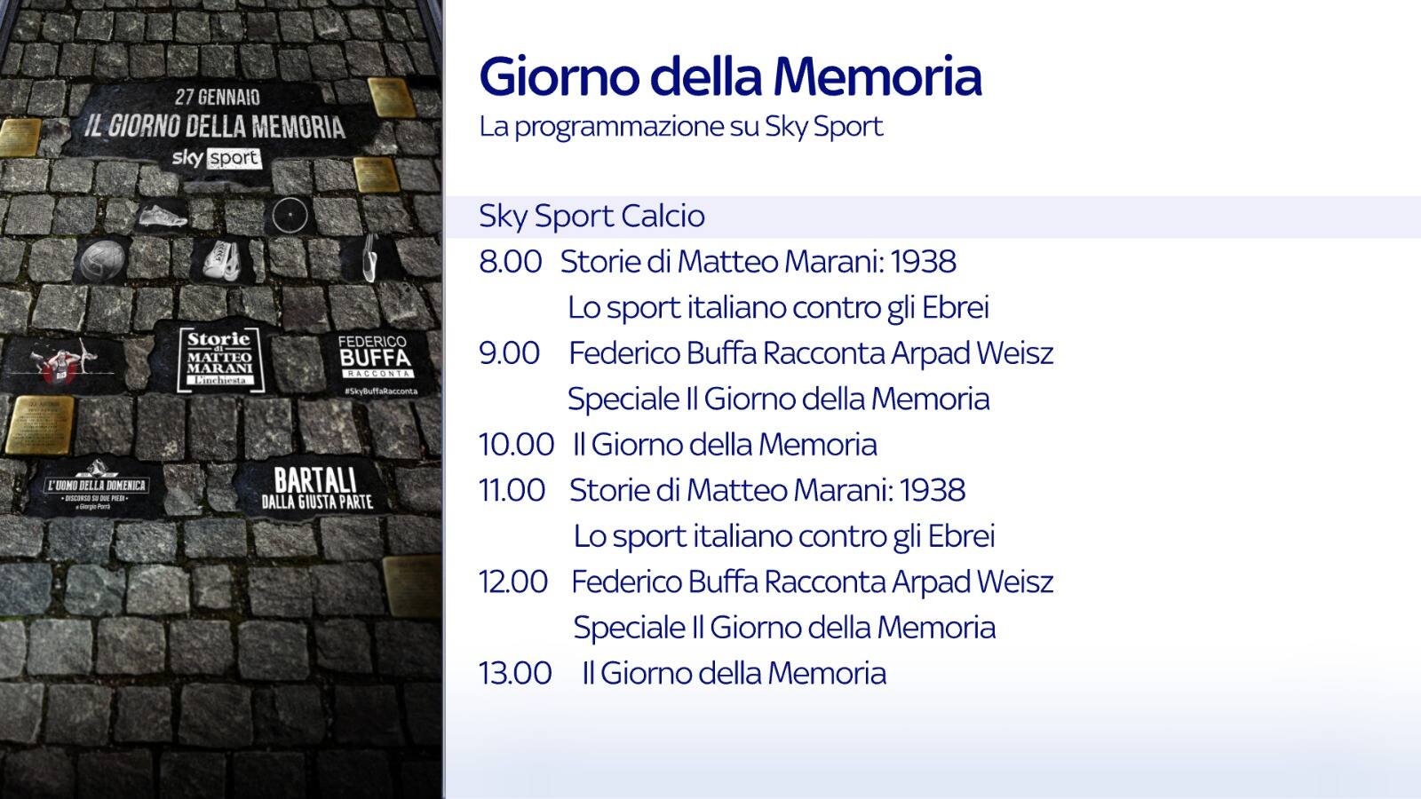 Oggi, sabato 27 gennaio, in occasione del Giorno della Memoria, la programmazione di Sky Sport Calcio fino alle ore 14 sarà caratterizzata dalle Produzioni Originali di Sky Sport dedicate al ricordo e all’omaggio alle vittime dell’olocausto. In particolare andranno in onda: “1938. Lo sport italiano contro gli ebrei” (ore 8 e 11); “Federico Buffa racconta: Arpad Weisz. Speciale Il Giorno della Memoria” (ore 9 e 12); “Un giorno nella memoria. Un legame nel tempo, nel nome dello sport” (ore 10 e 13). Tutte le Produzioni Originali sono disponibili anche on demand.