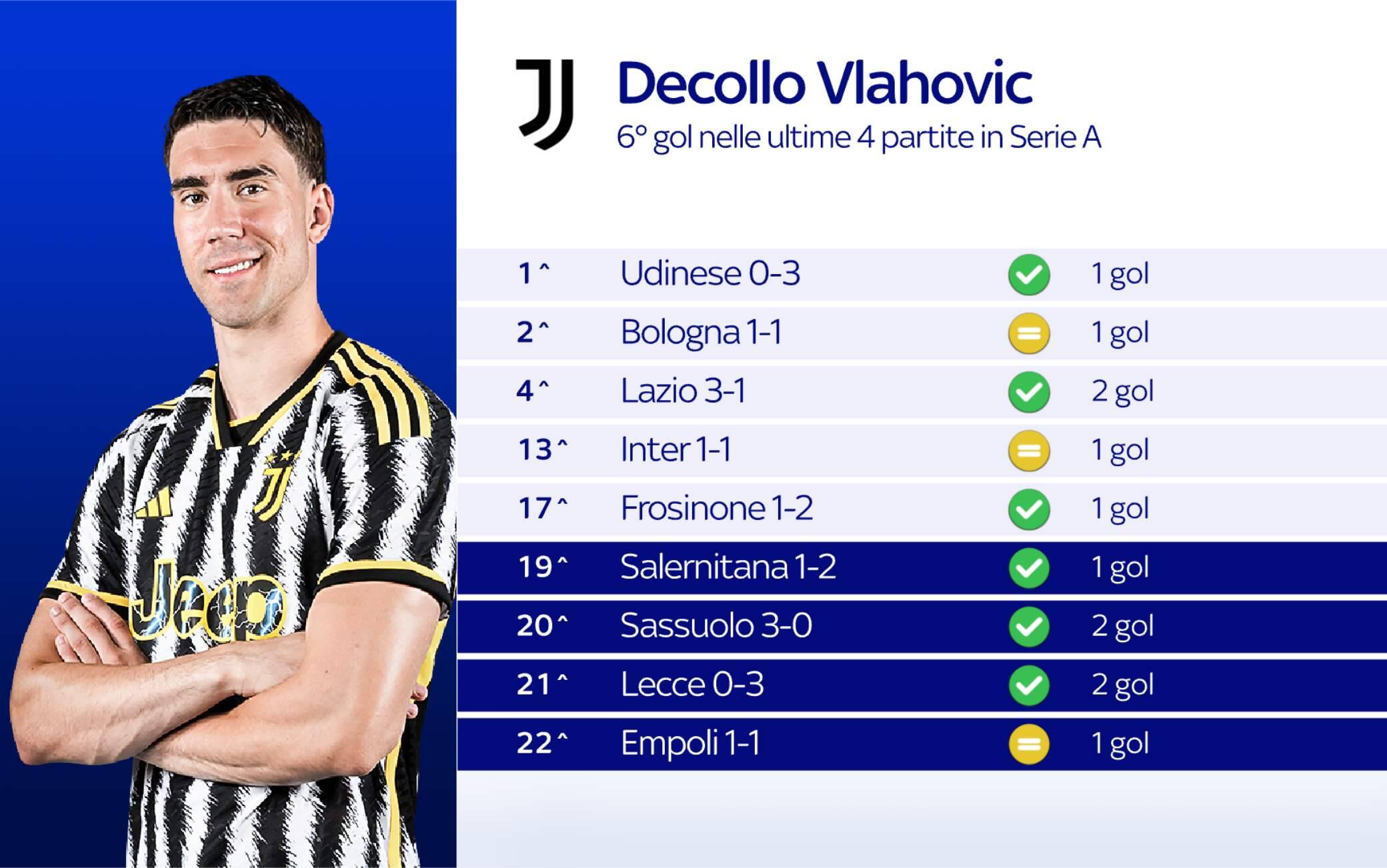video analisiNel pareggio della Juventus in casa contro l'Empoli, c'è una nota lieta per Allegri: la conferma dell'incredibile momento di forma che sta vivendo Dusan Vlahovic. Nel video l'analisi di Giovanni Guardalà. Qui solo un dato che parla da solo: 6 gol nelle ultime 4 partite, altrettanti nelle prime 18!