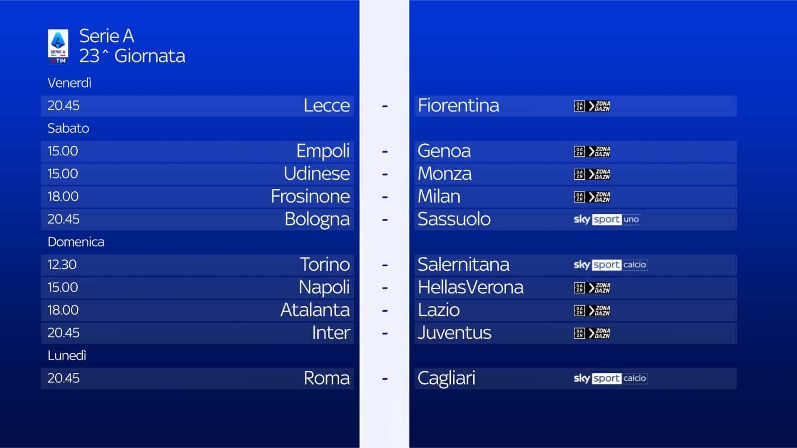 Il sabato si inizia con un doppio appuntamento alle 15.00: Empoli-Genoa e Udinese-Monza. La sera, alle 18.00, scendono in campo Frosinone e Milan, mentre alle 20.45 è la volta di Bologna-Sassuolo, in diretta su Sky Sport Calcio e Sky Sport 4K e in streaming su NOW. Telecronaca di Davide Polizzi con il commento di Giancarlo Marocchi. I collegamenti a bordocampo sono a cura di Vanessa Leonardi e Marco Nosotti.