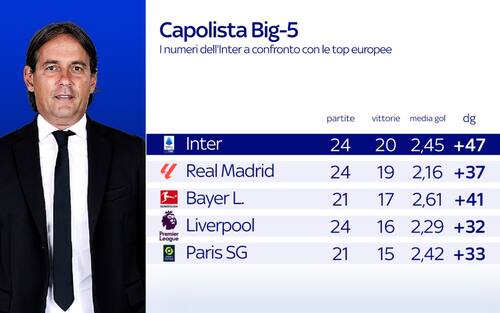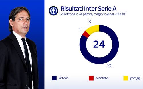 - Venti vittorie in 24 partite, dieci punti di vantaggio sulla Juventus e una media punti unica in Europa. È l'incredibile ritmo dell'Inter di Simone Inzaghi che, grazie alla vittoria sulla Salernitana, ha allungato ulteriormente in classifica