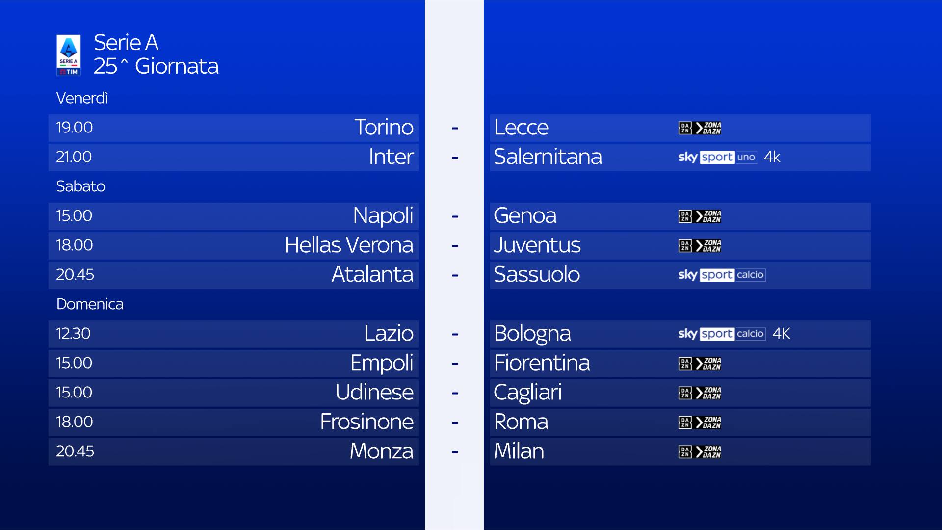 La partita tra Empoli e Fiorentina, valida per la 25^ giornata di Serie A, sarà trasmessa domenica 18 febbraio alle 15.00 in diretta sull’app di DAZN, disponibile nella sezione App di Sky Q e Sky Glass. Gli abbonati Sky Q (via satellite o via internet) e Sky Glass che sono anche clienti DAZN, potranno accedere all’offerta DAZN anche col controllo vocale, tramite il comando “Apri DAZN”, comodamente in unico posto e con un unico dispositivo. Su Sky Q e My Sky, la partita è visibile anche su ZONA DAZN, disponibile al canale 214 del telecomando Sky. Per vedere il canale ZONA DAZN, i clienti DAZN devono aderire ad una specifica opzione disponibile all’interno dell’area “il mio account” su dazn.com. Per abbonarsi a DAZN ed attivare l’opzione per vedere il canale ZONA DAZN su Sky Q o My Sky, è necessario andare su dazn.com/sky e seguire le indicazioni per la sottoscrizione.