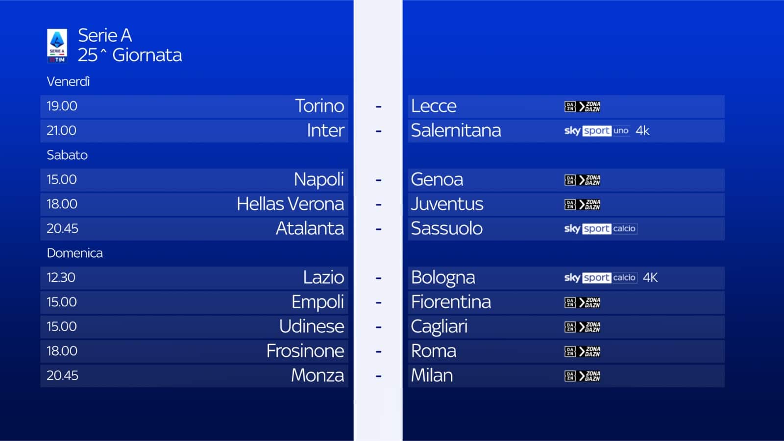 Partite Serie A oggi, il calendario e gli orari della 25^ giornata