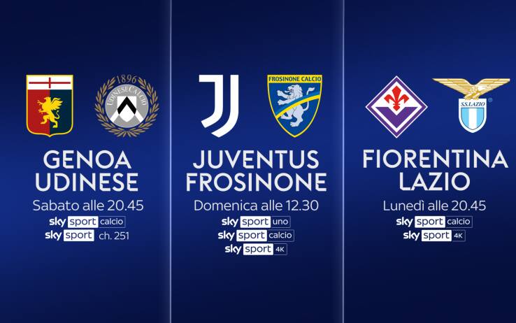 Il ventiseiesimo turno di Serie A si gioca tra venerdì 23 e lunedì 26 febbraio. L’anticipo del venerdì, alle 20.45, è Bologna-Verona. Sono tre gli appuntamenti del sabato, si inizia alle 15.00 con Sassuolo-Empoli e si prosegue alle 18.00 con Salernitana-Monza. La sera, alle 20.45, è la volta di Genoa-Udinese, in diretta su Sky Sport Calcio, Sky Sport 251 e in streaming su NOW. La domenica si apre alle 12.30 con Juventus-Frosinone, in diretta su Sky Sport Uno, Sky Sport Calcio, Sky Sport 4K e in streaming su NOW. Si prosegue poi alle 15.00 con Cagliari-Napoli e alle 18.00 con Lecce-Inter. La sera, alle 20.45, la sfida Milan-Atalanta. I posticipi del lunedì chiudono la giornata di campionato sono Roma-Torino e Fiorentina-Lazio, in diretta su Sky Sport Calcio, Sky Sport 4K e in streaming su NOW.