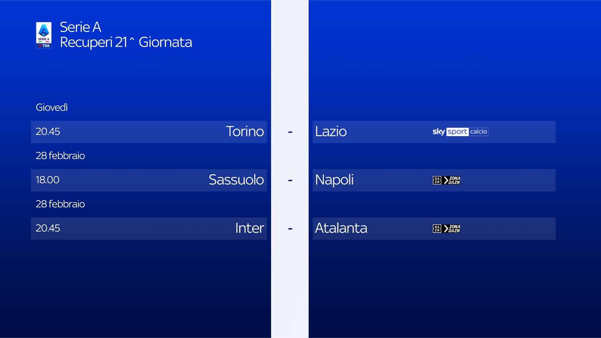 La partita tra Torino e Lazio, recuper della 21^ giornata di Serie A, sarà trasmessa giovedì 22 febbraio alle 20.45 su Sky Sport Calcio, Sky Sport 254 e in streaming su NOW. Telecronaca di Antonio Nucera con il commento di Lorenzo Minotti. I collegamenti a bordocampo sono a cura di Paolo Aghemo e Matteo Petrucci. Dalle ore 20 e dalle 22.40 appuntamento con 'La Casa dello Sport- Night' con Mario Giunta in compagnia di Massimo Marianella e Gianfranco Teotino.