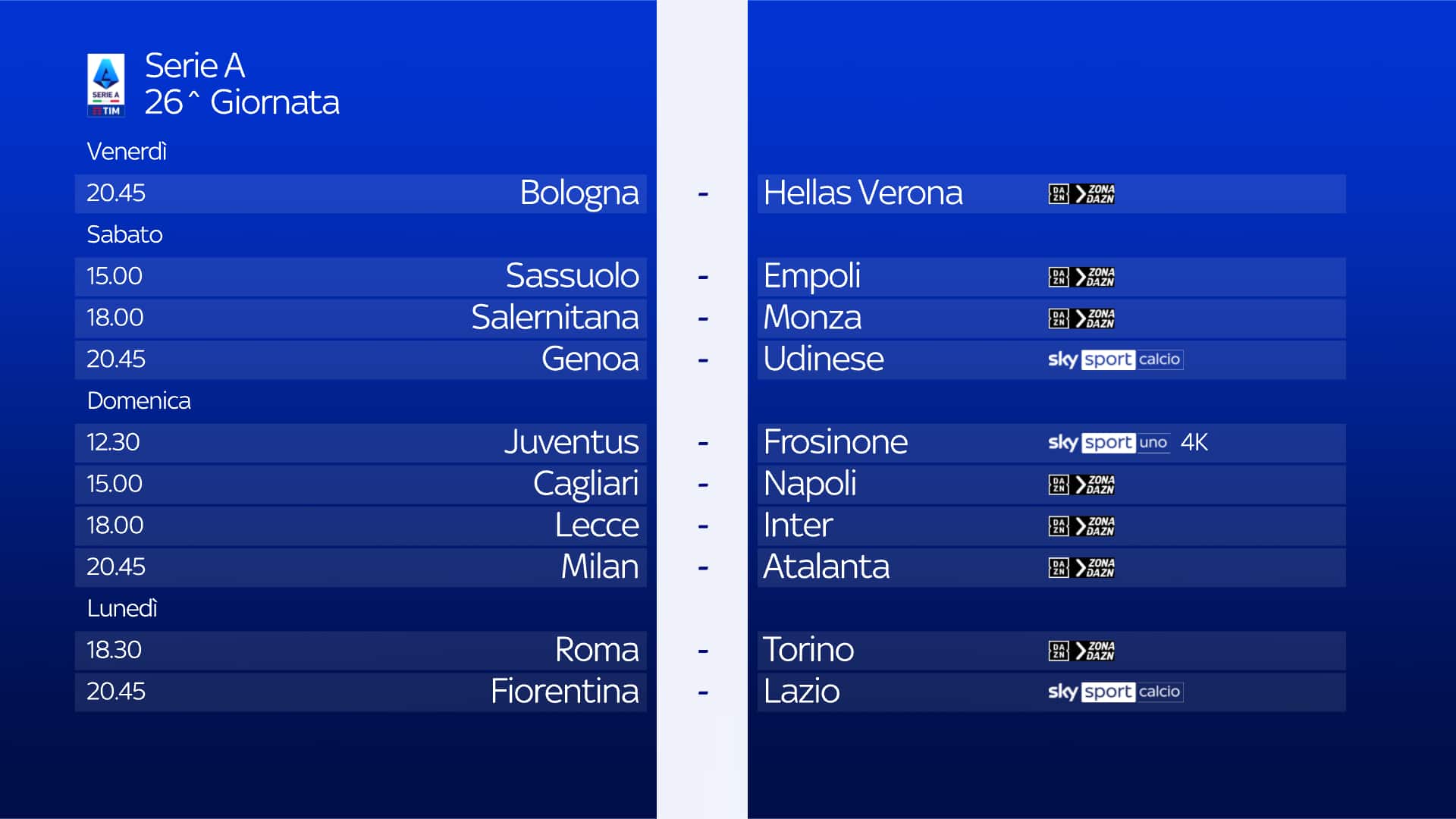 guida tvLa partita tra Roma e Torino della 26^giornata di Serie A si gioca oggi, lunedì 26 febbraio alle 18.30 e sarà in diretta sulla app di DAZN e su ZONA DAZN, disponibile al canale 214 del telecomando Sky