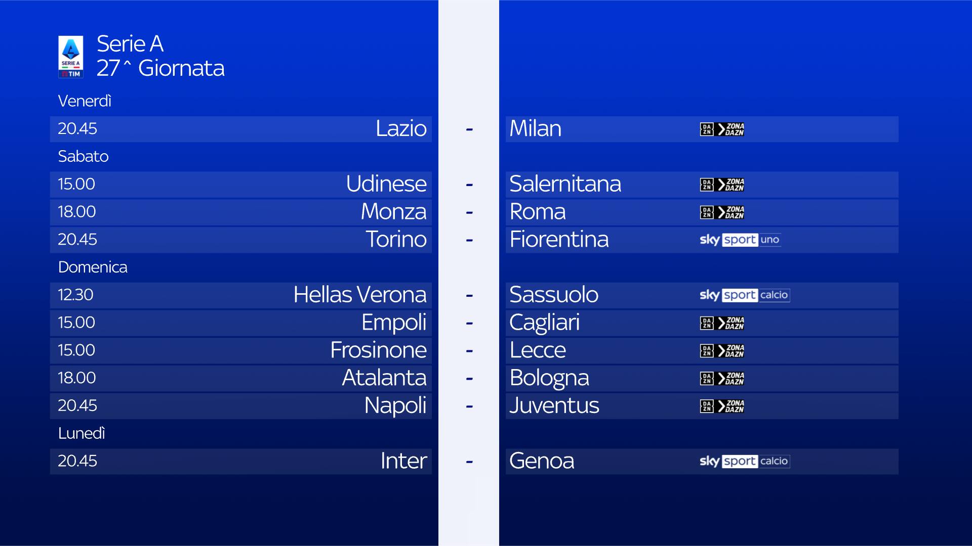 guida tvLa partita tra Lazio e Milan della 27^giornata di Serie A si gioca oggi, venerdì 1 marzo alle 20.45 e sarà in diretta sulla app di DAZN e su ZONA DAZN, disponibile al canale 214 del telecomando Sky