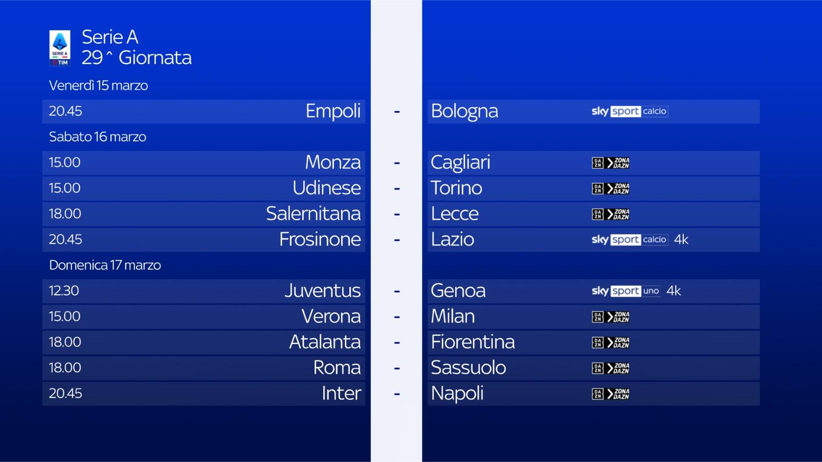 - ore 15.00: Monza-Cagliari su ZONA DAZN 2