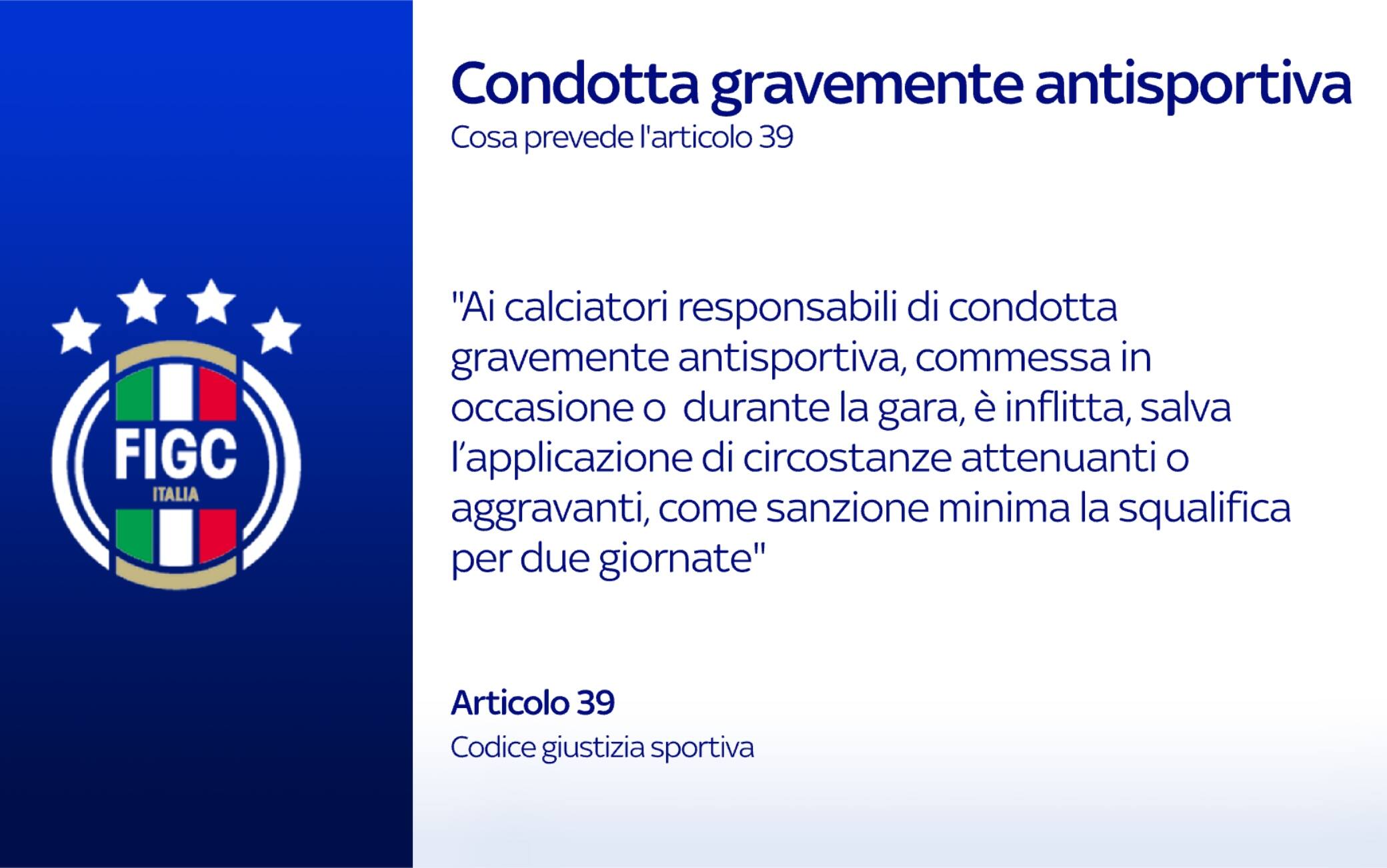 L'articolo 39, che sanziona i comportamenti gravemente antisportivi. E’ quello che venne utilizzato per la rissa nel derby di Coppa Italia tra Ibrahimovic e Lukaku, anche se in quel caso l'iter fu diverso e si chiuse con il patteggiamento - un'ammenda - non percorribile in questo caso. Se il giudice, forzando un po' l'interpretazione, facesse riferimento a quello, si partirebbe da un minimo di due giornate, con la possibilità di scendere o salire in caso di circostanze attenuanti o, più probabilmente, aggravanti.