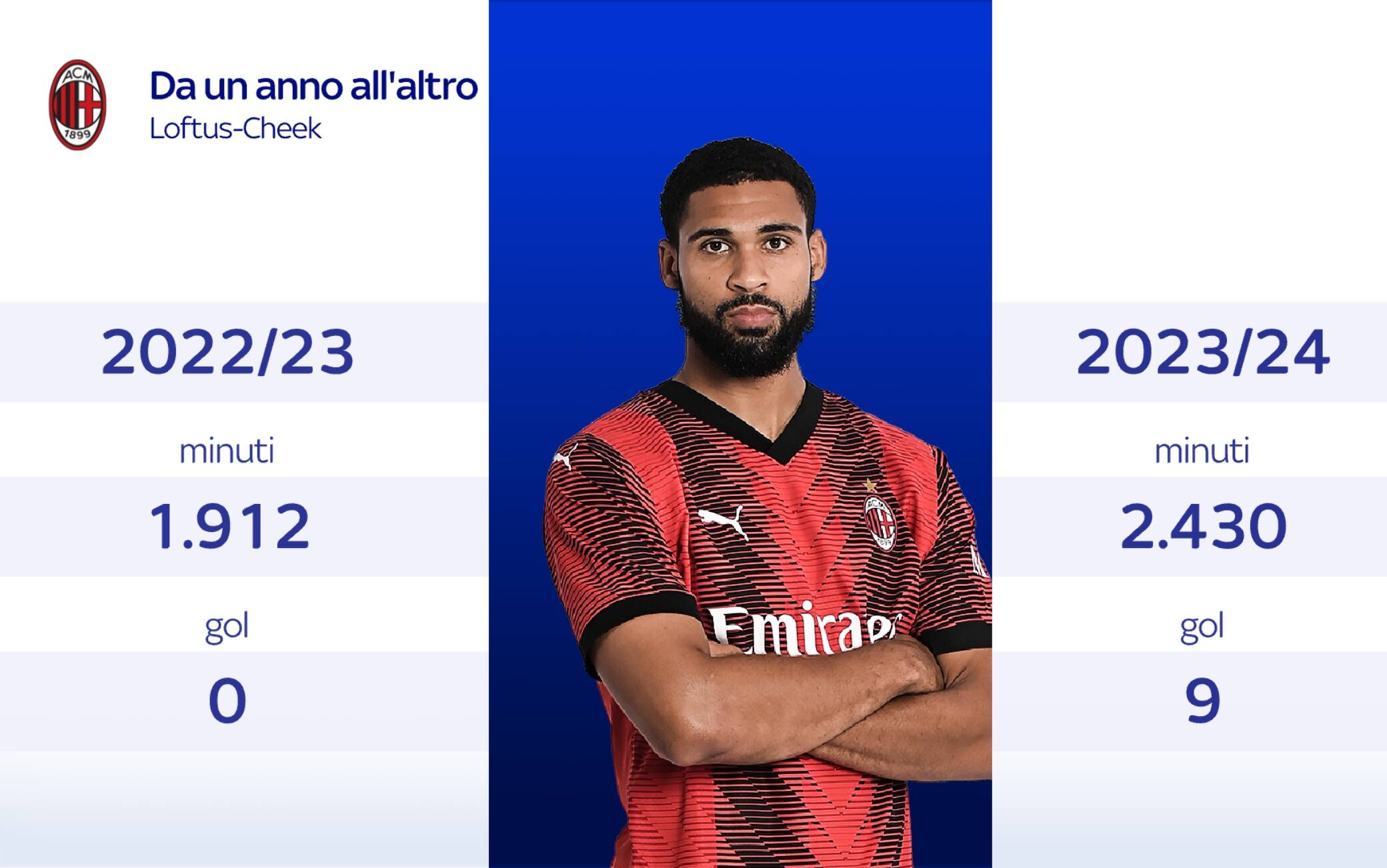Loftus-Cheek non è da meno, dagli zero gol dello scorso anno a Londra ai 9 di questa stagione grazie al un ruolo ritagliato su misura. La sua esclusione dalla lista dei convocati dell'Inghilterra ha fatto rumore anche in patria perché Ruben sembra effettivamente tutt'altro giocatore rispetto all'ultima stagione.
