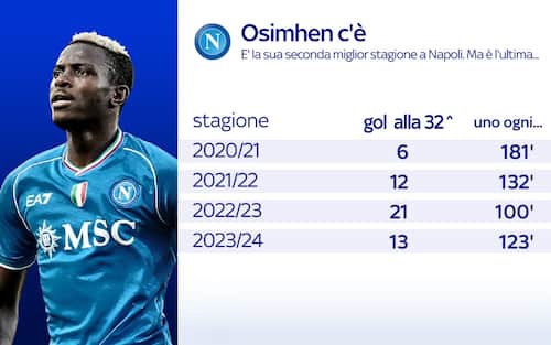- Nell'ultima giornata è andato ancora a segno l'attaccante nigeriano, a quota 13 in questo campionato. Con un gol ogni 123 minuti, è la seconda miglior media per Osimhen da quando gioca in Serie A (meglio solo l'anno scorso con una rete ogni 100 minuti), ma questa sarà con ogni probabilità la sua ultima stagione in Italia: il giocatore è, infatti, destinato all'addio in estate (ha una clausola da 130 milioni) e sostituirlo a dovere sarà uno dei nodi da risolvere per la società.
