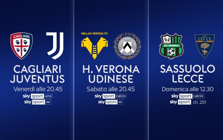 La partita tra Cagliari e Juventus della 33^ giornata di Serie A, sarà trasmessa venerdì 19 aprile alle 20.45 in diretta su Sky Sport Uno, Sky Sport Calcio, Sky Sport 251, Sky Sport 4K e in streaming su NOW. Telecronaca di Riccardo Gentile con il commento di Giancarlo Marocchi. I collegamenti a bordocampo sono a cura di Valentina Caruso, Francesco Cosatti, Giovanni Guardalà. Inoltre appuntamento con 'La Casa dello Sport-Night' per il pre e post partita con Mario Giunta in compagnia di Massimo Marianella, Fabio Tavelli e Fabio Quagliarella.